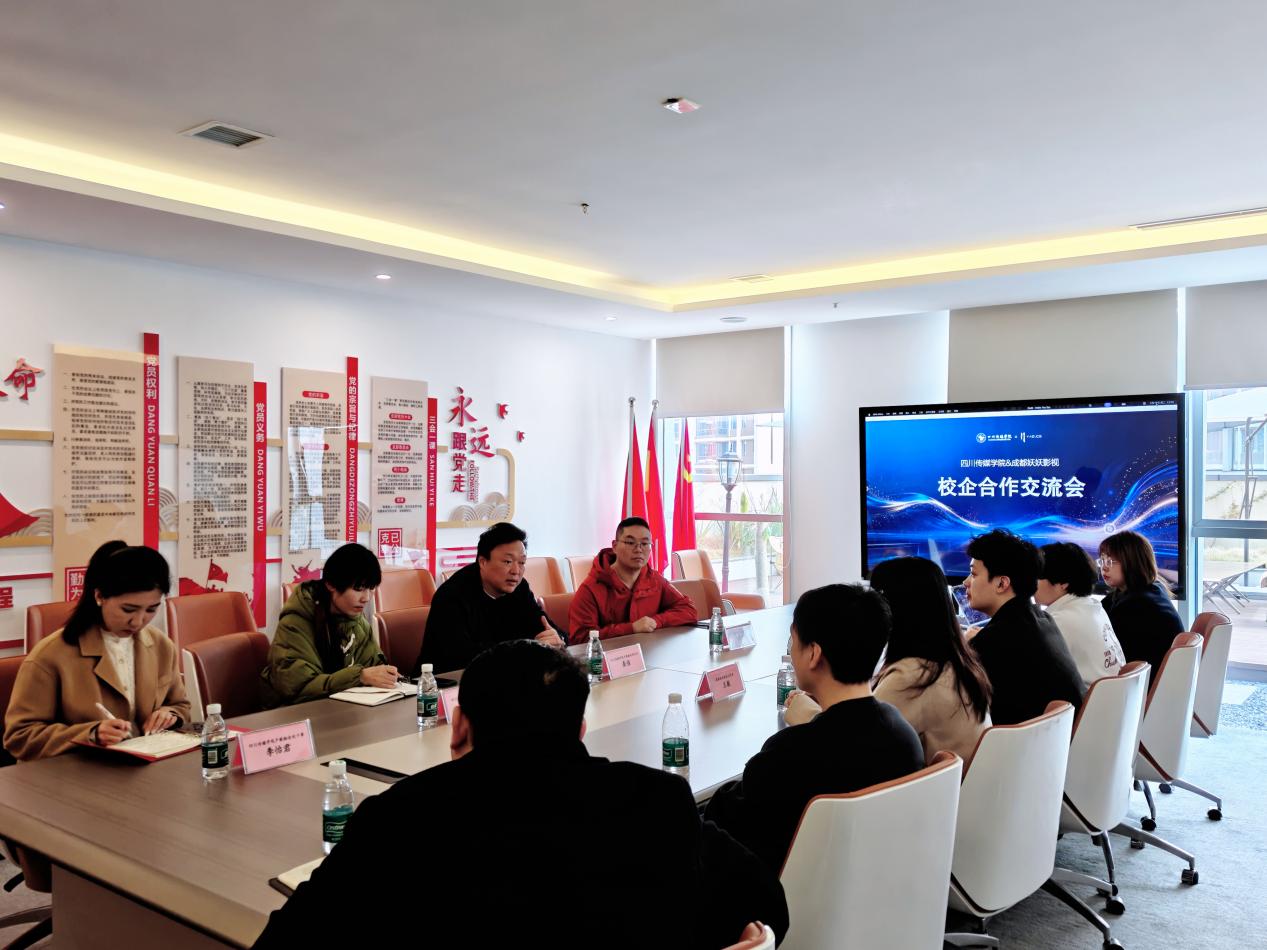走访调研期间,学校一行受到两家企业的热情接待与高度重视。在成都妖妖影视科技有限公司,我校优秀校友、公司总经理王敏详细介绍了企业发展历程、核心业务布局及行业发展趋势,通过案例展示、成果分享等形式,全面呈现了企业在相关领域的技术优势与市场竞争力,并明确表达了深化与母校在人才输送、项目合作、产学研协同等方面合作的强烈意愿。龚强处长对企业取得的发展成就及对母校人才培养工作的支持表示肯定,他指出,四川传媒学院始终坚持 “根植传媒 产教融合 园校合一 实践育人” 的特色发展模式,产教融合处作为校企合作的桥梁纽带,将进一步强化与优质企业的常态化沟通机制,聚焦行业人才需求导向,持续优化人才培养方案,着力提升学生实践应用能力与岗位适配度,为社会输送更多高素质应用型人才。同时,龚强处长强调,学校高度重视招生就业工作的闭环衔接,当前正积极推进 AI 技术与教育教学的深度融合,通过教学模式创新、实训平台升级等举措,确保高校人才培养与企业发展需求、市场行业趋势同频共振,从根源上破解人才供需脱节问题。